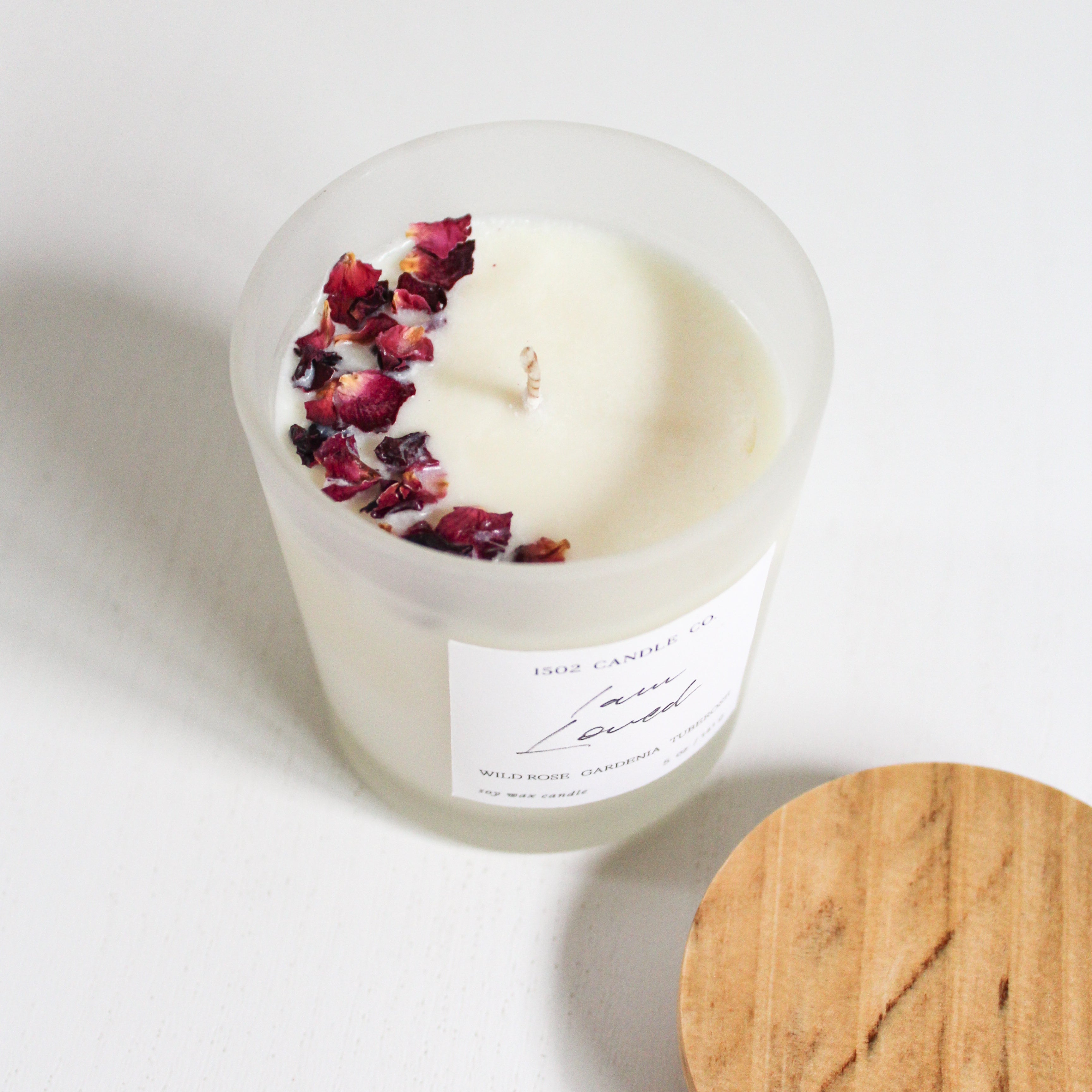I am Loved - Wild Rose, Gardenia & Tuberose Romantic, comforting florals to remind you of your worth. Topped with dried red rose petals.